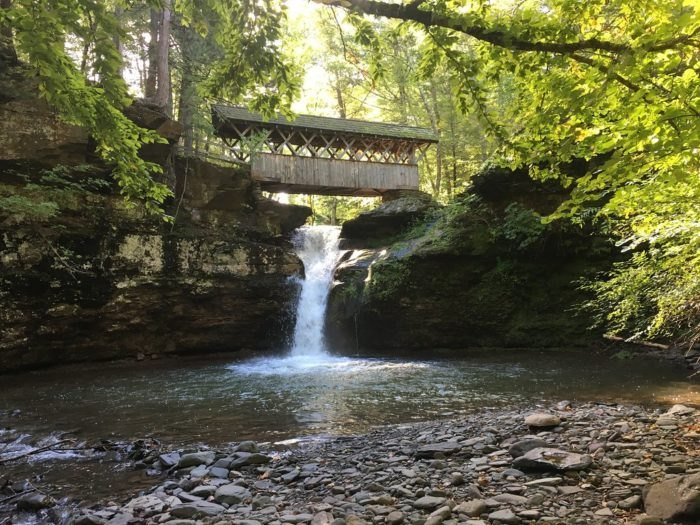 The falls are right behind the inn. One trail will take you to the Alfred Clark Covered Bridge that’s at the top of Artist Falls. The second trail leads to the bottom of the falls and Winter Clove Brook, so it’s awesome to take both trails to get two different views and to spice up your photos! It’s in a forest with pine trees and there are dirt trails, so yes, it’s the epitome of the phrase “one with nature.”
